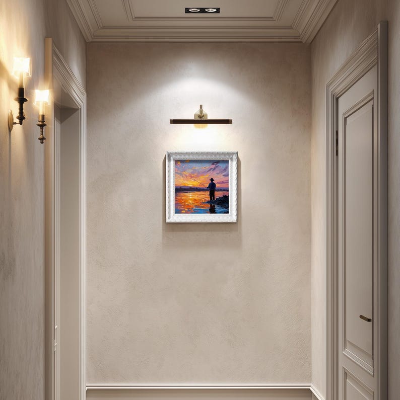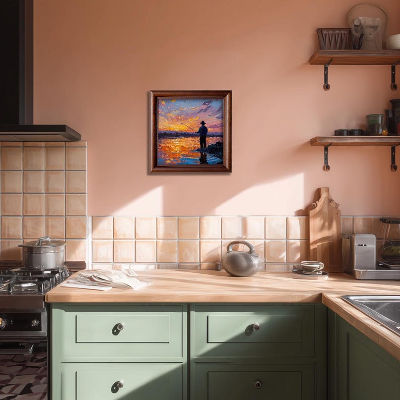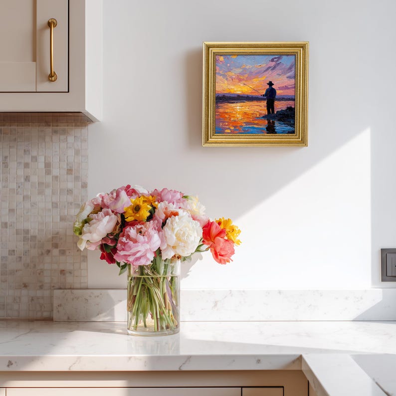 Hand-Painted Sunset Fishing Oil Painting: Living Room Wall Art Decor, 5X5 Fisherman Gift