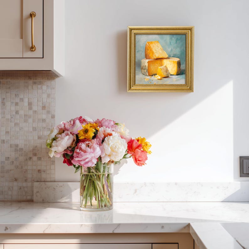 Mini Cheese Still Life Oil Painting-Rustic Kitchen Wall Art in Golden Beaded Frame-Hand-Painted Food Artwork-Home Decor Gift For Foodie