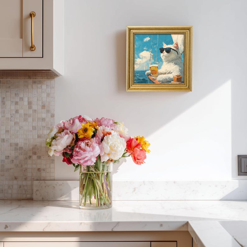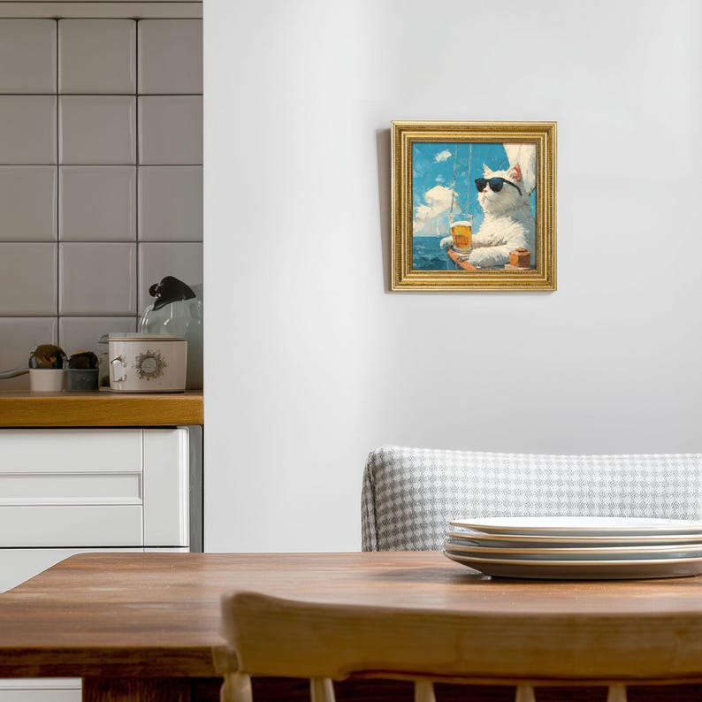 Mini Cool Kitty Oil Painting-Relaxed Cat Portrait In Golden Beaded Frame-Hand-Painted Living Room Decor-Gift For Cat Lover and Pet Lover