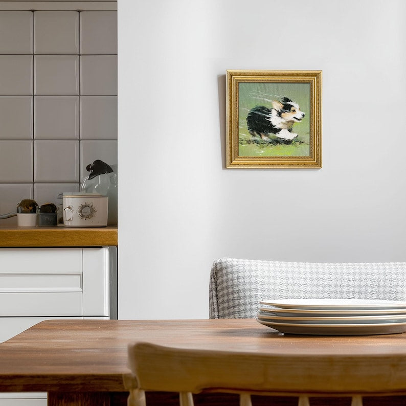 Mini Corgi Oil Painting in Gold Frame: Hand-Painted Dog Wall Art