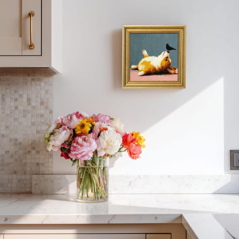 Mini Corgi Oil Painting: Playful Puppy Portrait in Golden Frame
