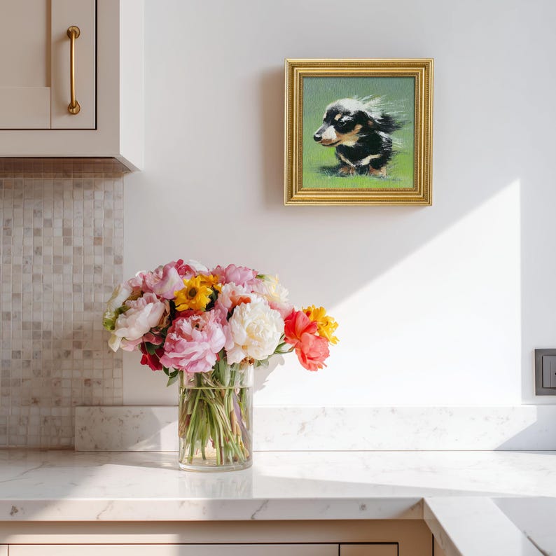 Mini Dachshund Oil Painting in Gold Frame: Hand-Painted Puppy Art