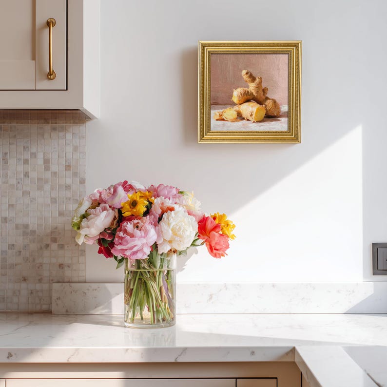 Mini Ginger Root Oil Painting: Rustic Kitchen Still Life in Gold Frame