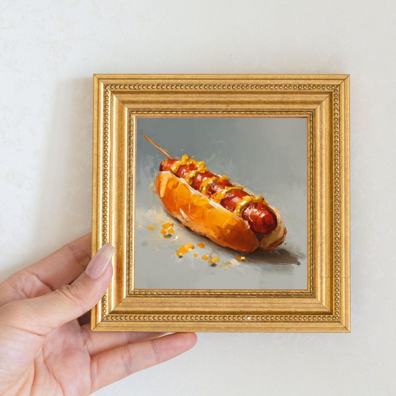 Mini Hot Dog Oil Painting in Gold Frame, Still Life Art Gift for Wall Decor Lover and Foodie, Original Painting for Kitchen Decor