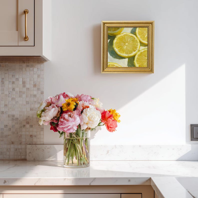 Mini Lemon Sliced Oil Painting-Still Life Fruit Artwork in Golden Beaded Frame-Hand-Painted Rustic Kitchen Wall Decor-Gift for Him or Her