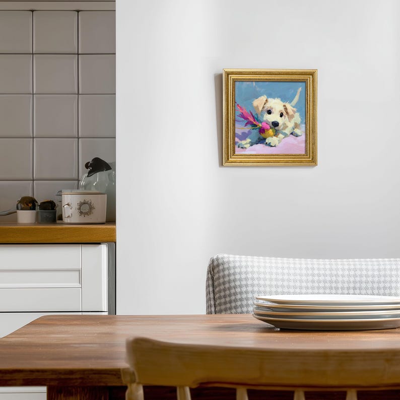 Mini Oil Painting: Dog Portrait with Toy in Golden Frame