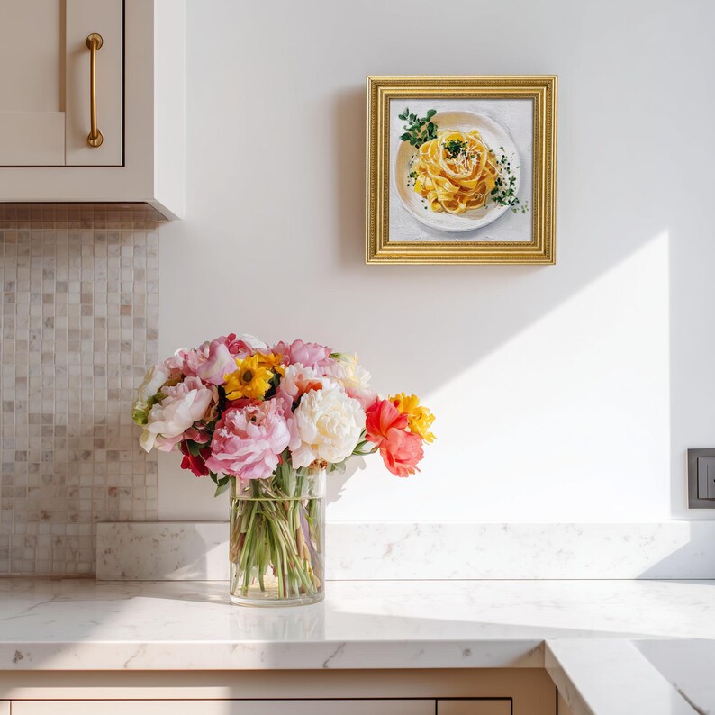 Mini Oil Painting of Farfalle Pasta in Gold Frame, Realistic Dining Art for Italian Kitchen & Cafe Decor, Still Life Art Gift for Him or Her