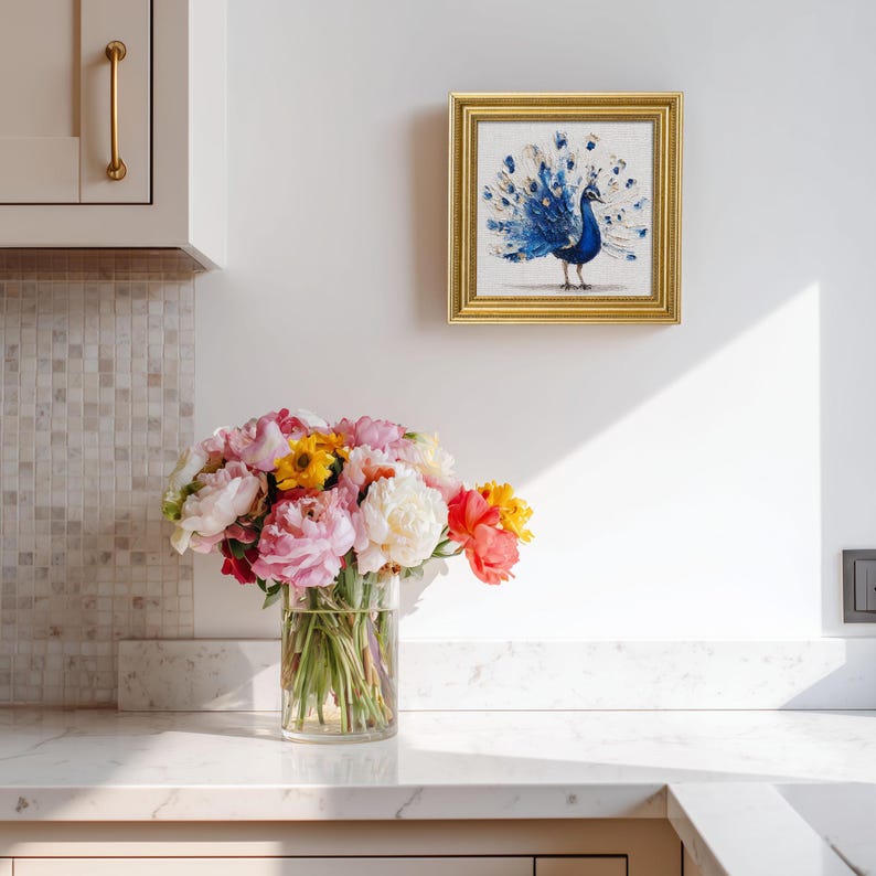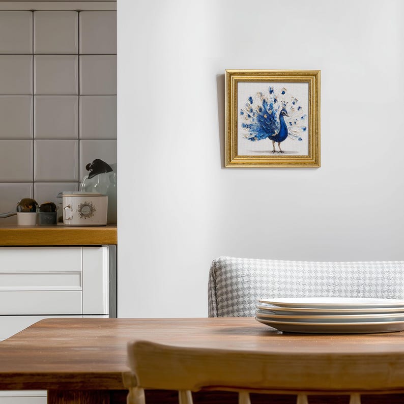 Mini Peacock Oil Painting: Vibrant Bird Portrait in Golden Beaded Frame