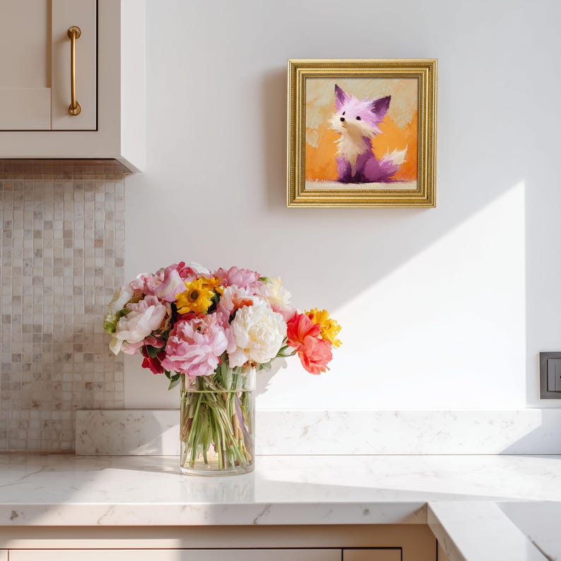 Mini Purple Fox Oil Painting: Golden Beaded Frame, Woodland Art