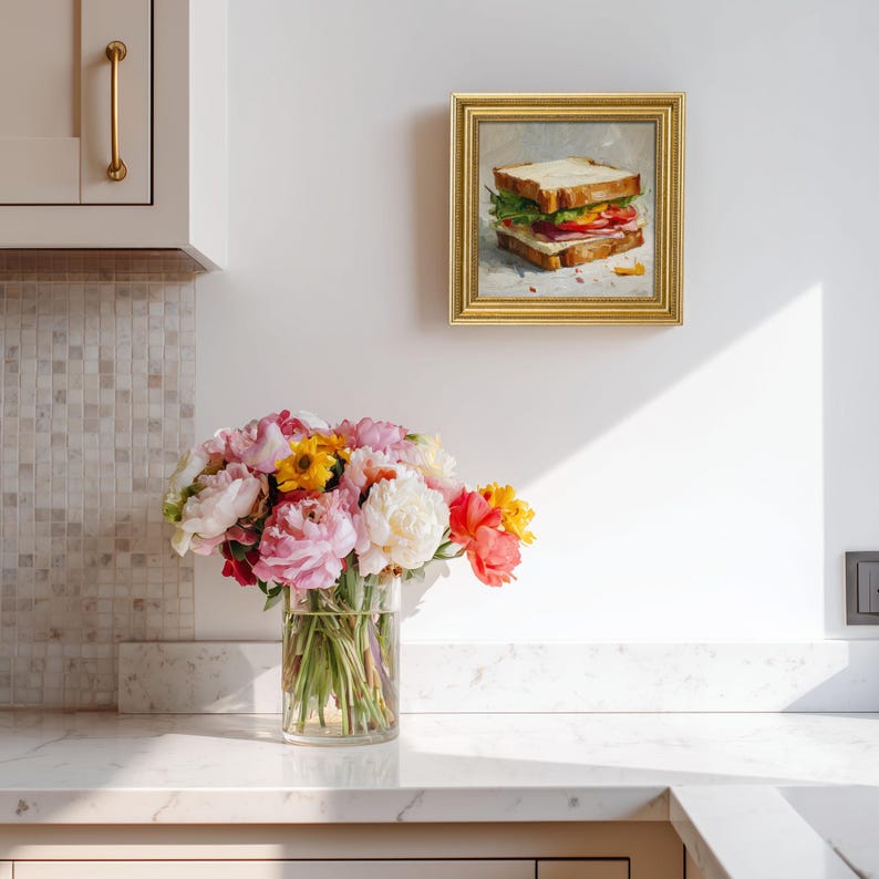 Mini Sandwich Oil Painting in Gold Frame | Small French Bakery Wall Art for Kitchen & Cafe | Still Life Art Gift for Wall Art Decor Lover