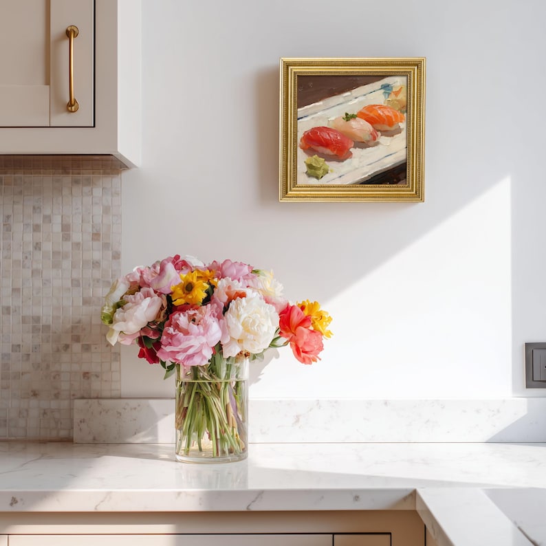 Mini Sushi Plate Oil Painting: Gourmet Kitchen Art, Gold Frame
