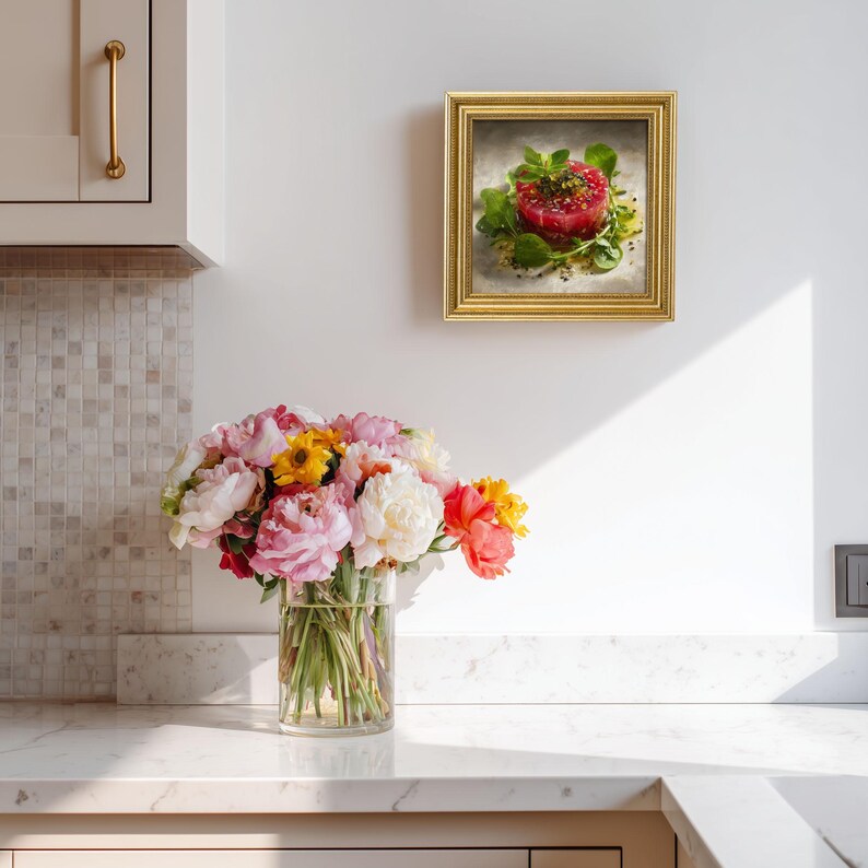 Mini Tuna Tartare Oil Painting in Gold Frame: Kitchen Still Life Art