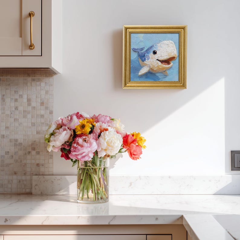 Mini Whale Oil Painting: Golden Beaded Frame, Ocean Animal Wall Art
