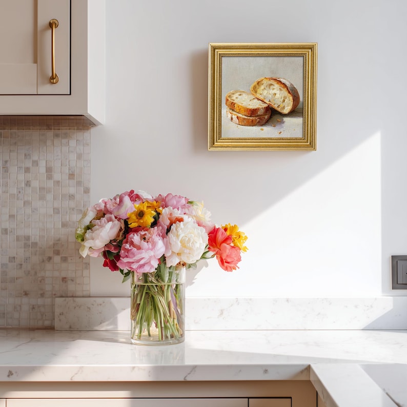 Small Rustic Bread Loaf Oil Painting in Gold Frame, Still Life Art Gift for Him or Her, Original Painting for French Kitchen and Bar Decor