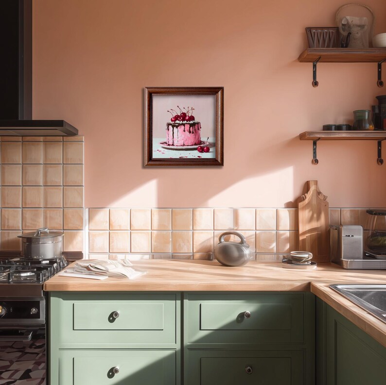 Still Life Cherry Chocolate Cake Oil Painting: Kitchen Wall Art Decor, Housewarming Gift