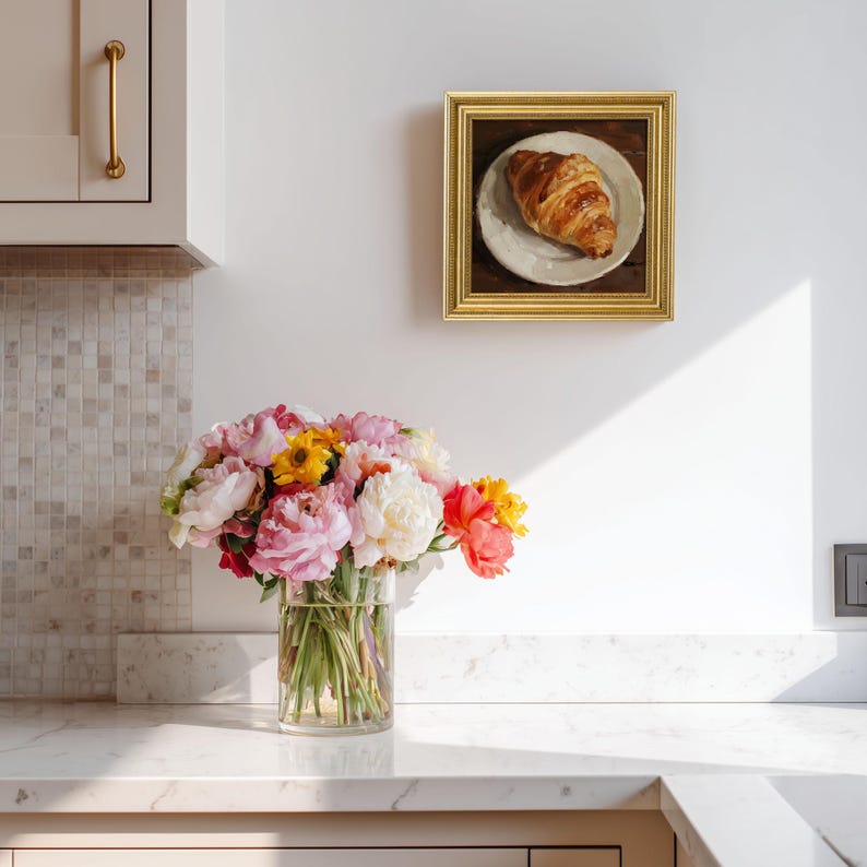A golden croissant captured in oil paint brings the warmth of French bakeries to your home. Perfect for foodies, bakers, or chefs, this hand-painted piece adds cozy charm to kitchens and dining rooms.
