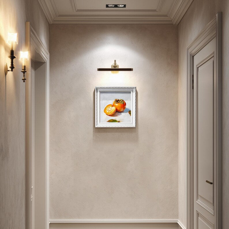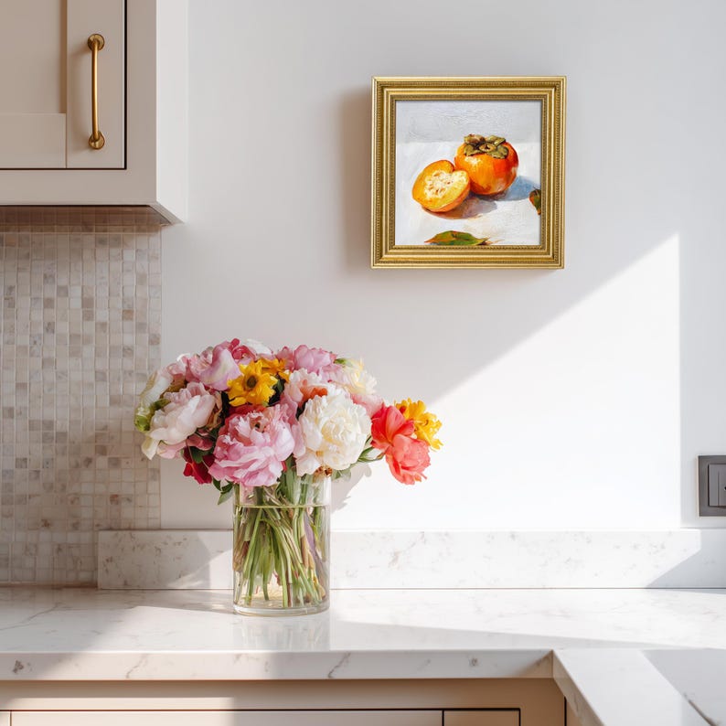 Still Life Persimmons Oil Painting: Kitchen Wall Art Decor, 5X5 Housewarming Gift
